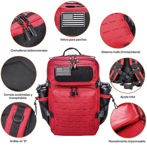 Mochila táctica V3 para Cross Training, gym o viajes. Color sólido en rojo. Desarrollada bajo estándares de las más alta calidad. Ideal tanto para interiores como en exteriores (senderismo, escalada,…), así como para viajes, transporte de material o transportes militares debido a su excelente calidad en la composición de su material. Resistente al agua. Transpirable. Pensada para los más exigentes y aventureros. Excelente ergonomía.